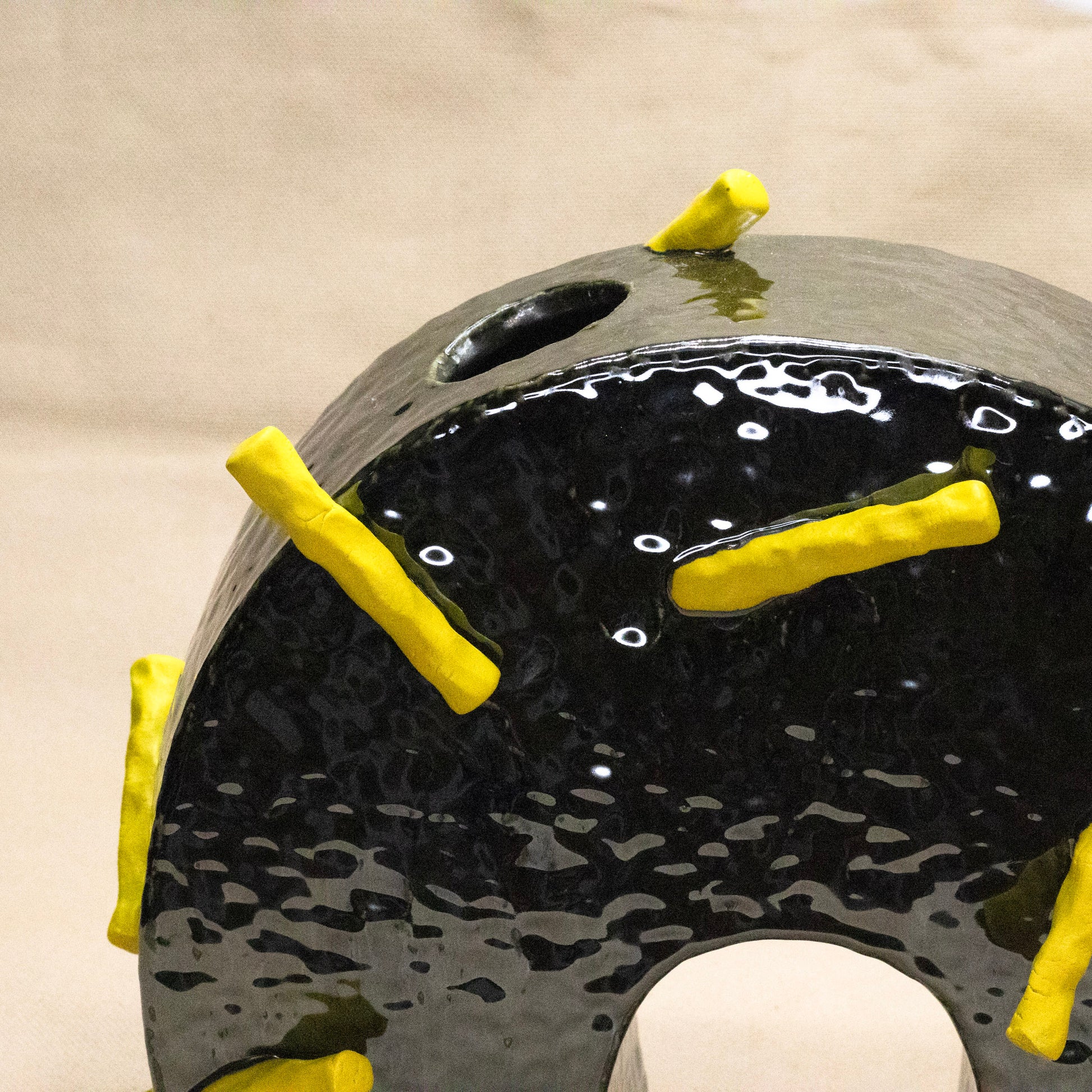 A dramatic sculptural vase with a reflective, rippled surface contrasted by bright yellow accent pieces. Handbuilt using clay slabs. Materials: stoneware, underglaze, glaze. Handwash only. Measures 9.5" tall, 12.5" wide, and 6" deep.