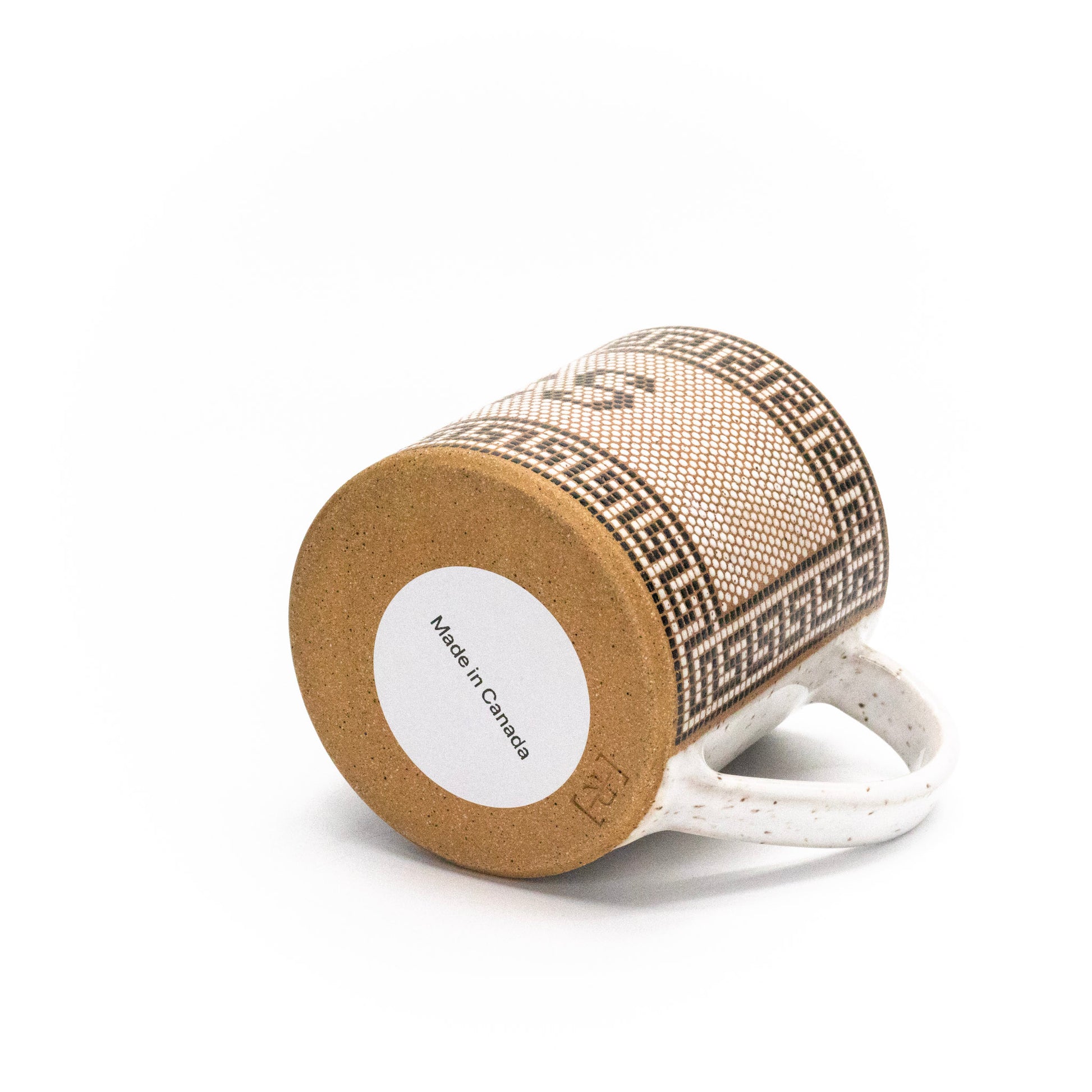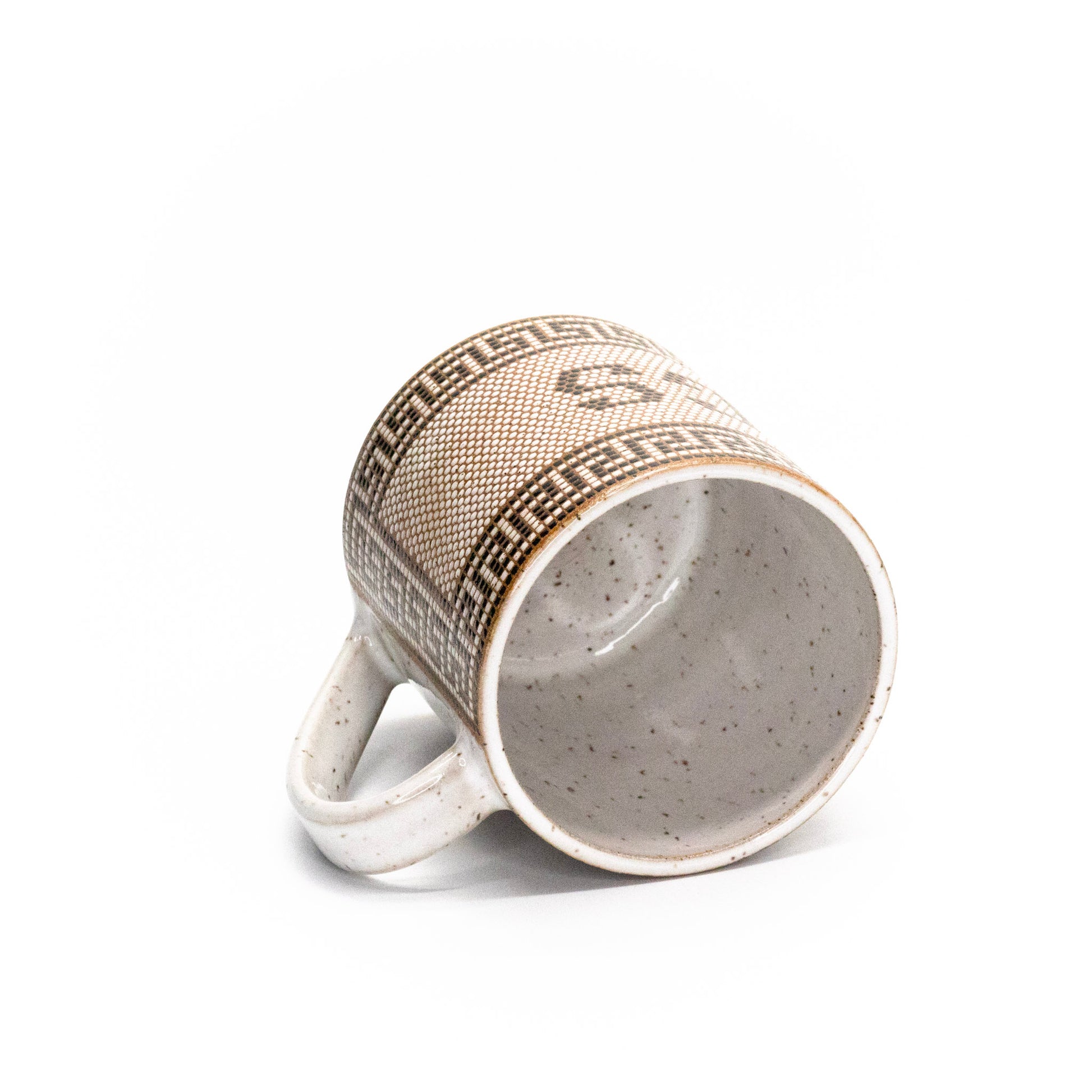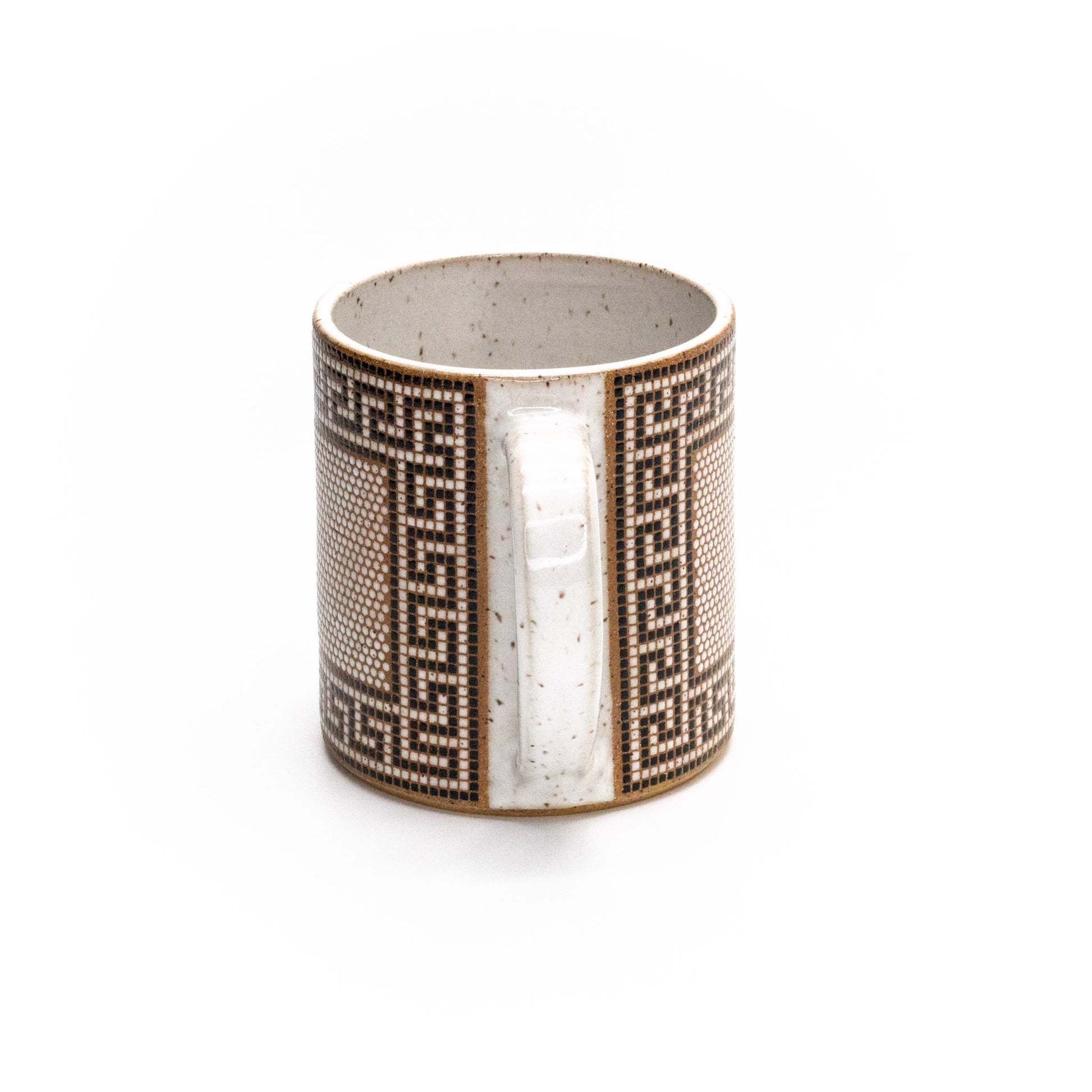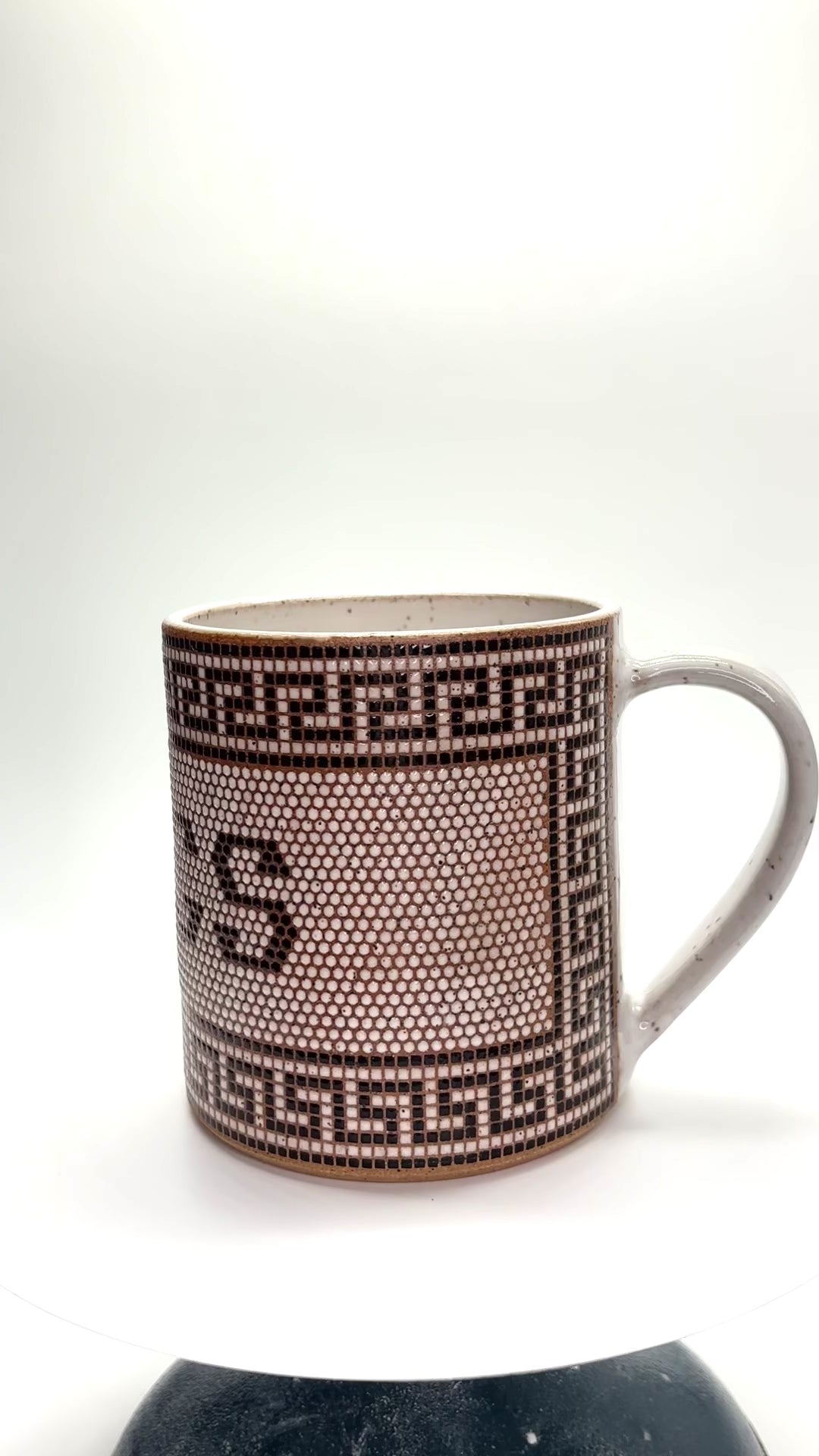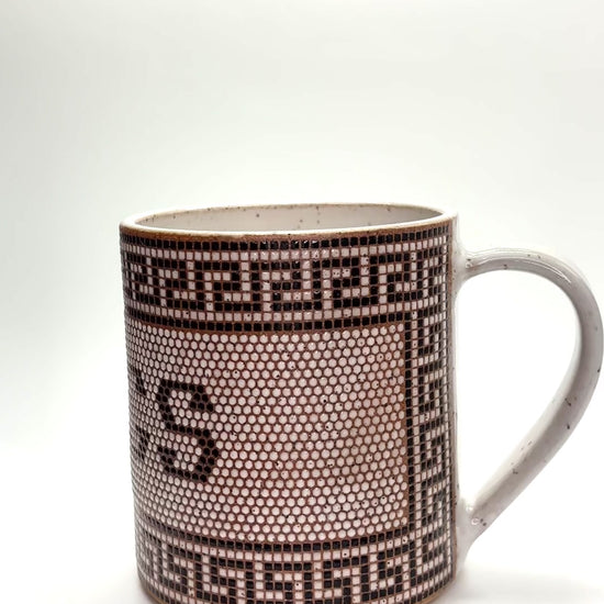 replicating tiling in front of an old apothecary in the town of Missoula, Montana, this mug has over 5,000 tiles that cover the entire outside of the mug except the handle area. Made from brown speckled stoneware and fired to cone 6. Volume is roughly 13-14 oz