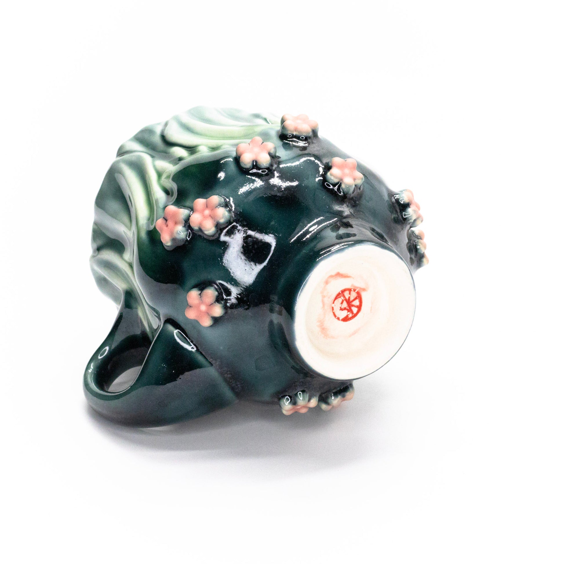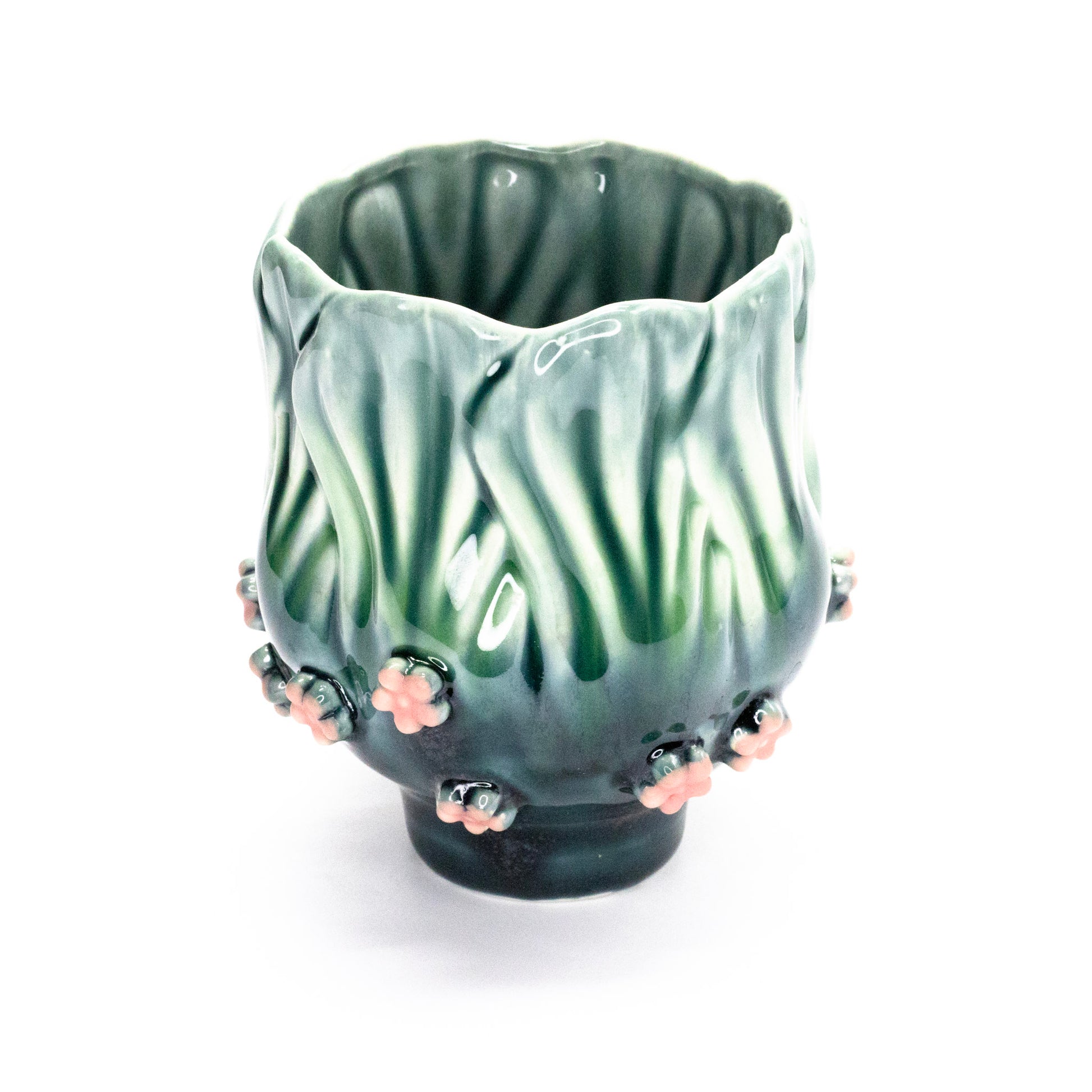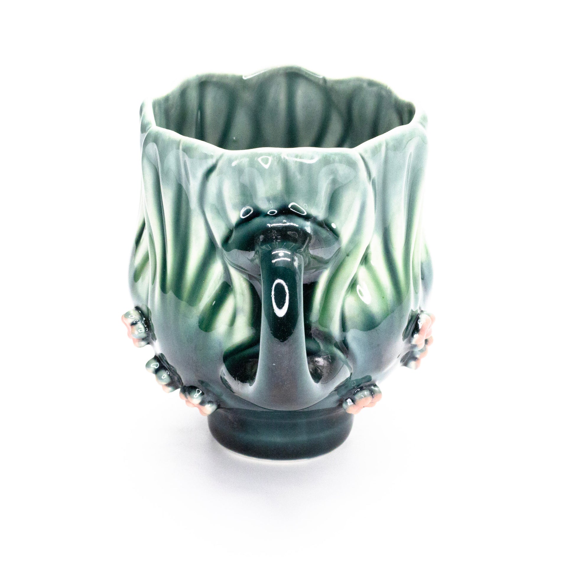 Slip cast porcelain fired in cone 6 oxidation. Dimensions are 4 x 5 x 5 inches. Holds approximately 10 ounces of liquid.