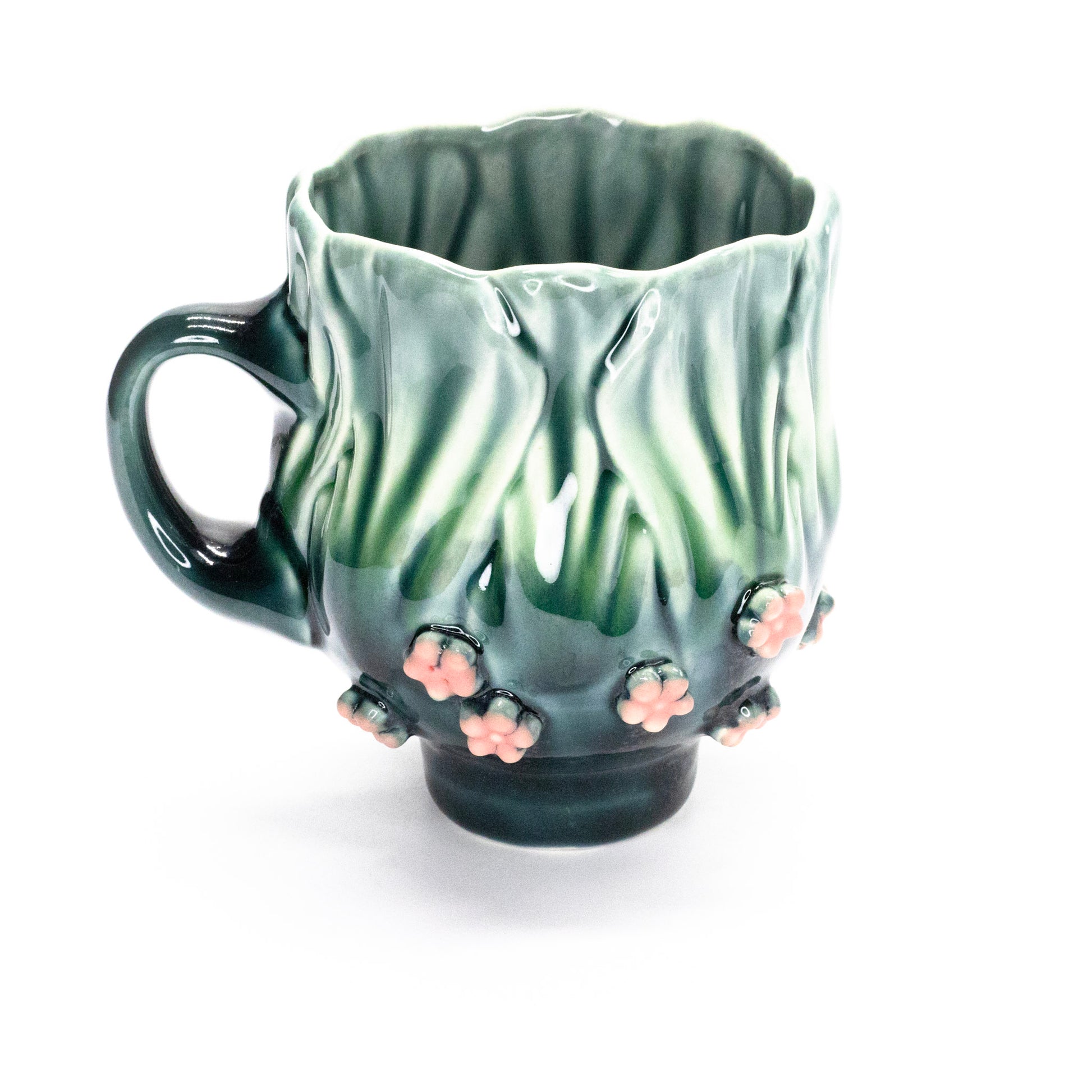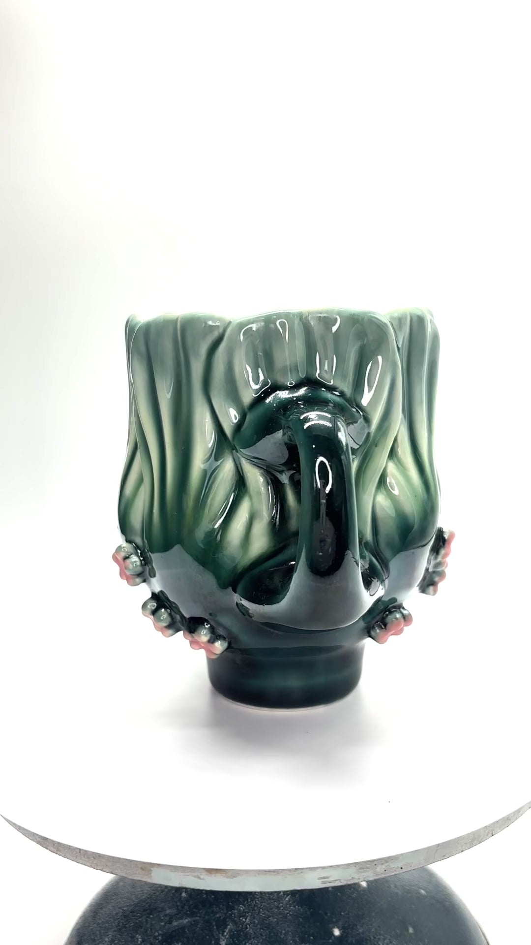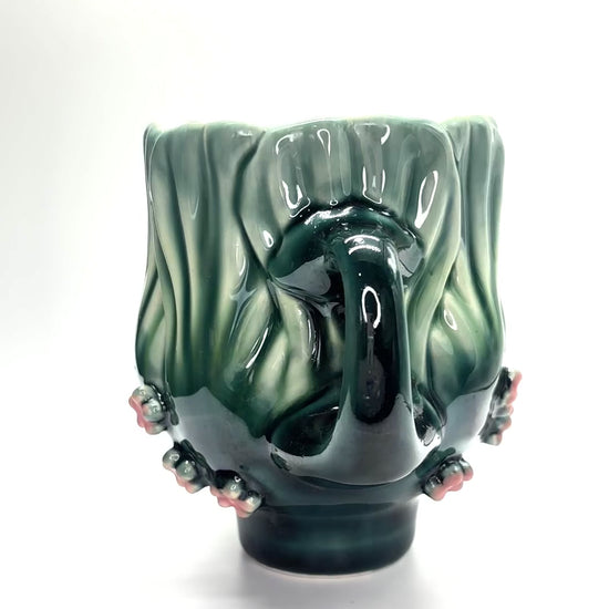 Slip cast porcelain fired in cone 6 oxidation. Dimensions are 4 x 5 x 5 inches. Holds approximately 10 ounces of liquid.