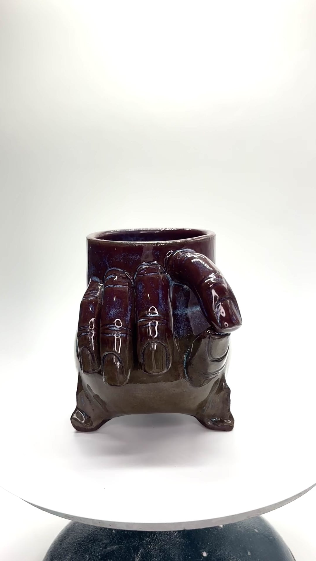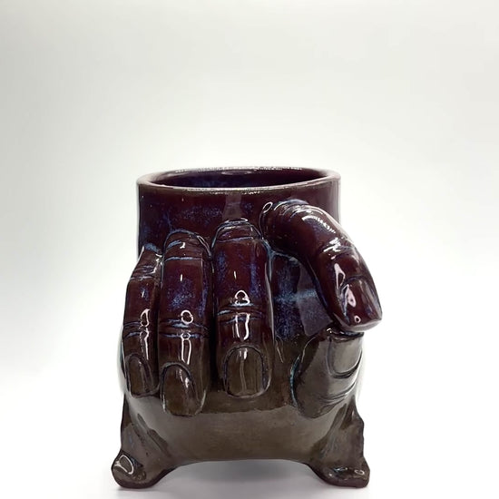 Midfire brown clay, midfire glaze, 8oz, h: 4in, di: 3in, hand sculpted fingers