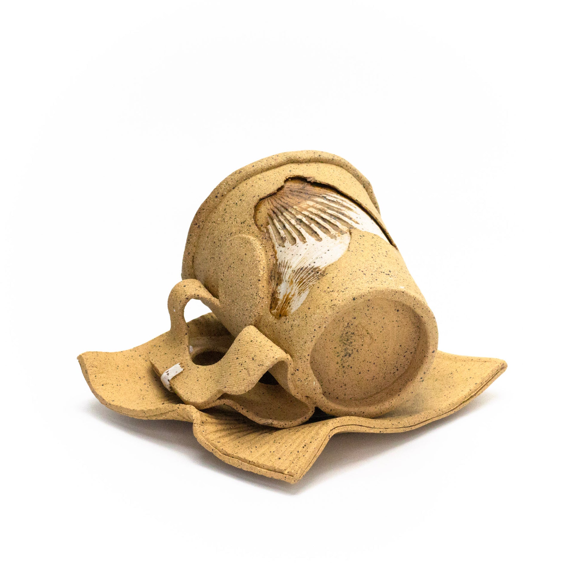 A speckled buff stoneware piece fired at cone 6 made to mimic the appearance of paper coffee cups. Dimensions- height: 3.8 inches, width: 4.5 inches, diameter at top: 3.25 inches diameter at bottom: 2.25 inches volume= 10.7 ounces