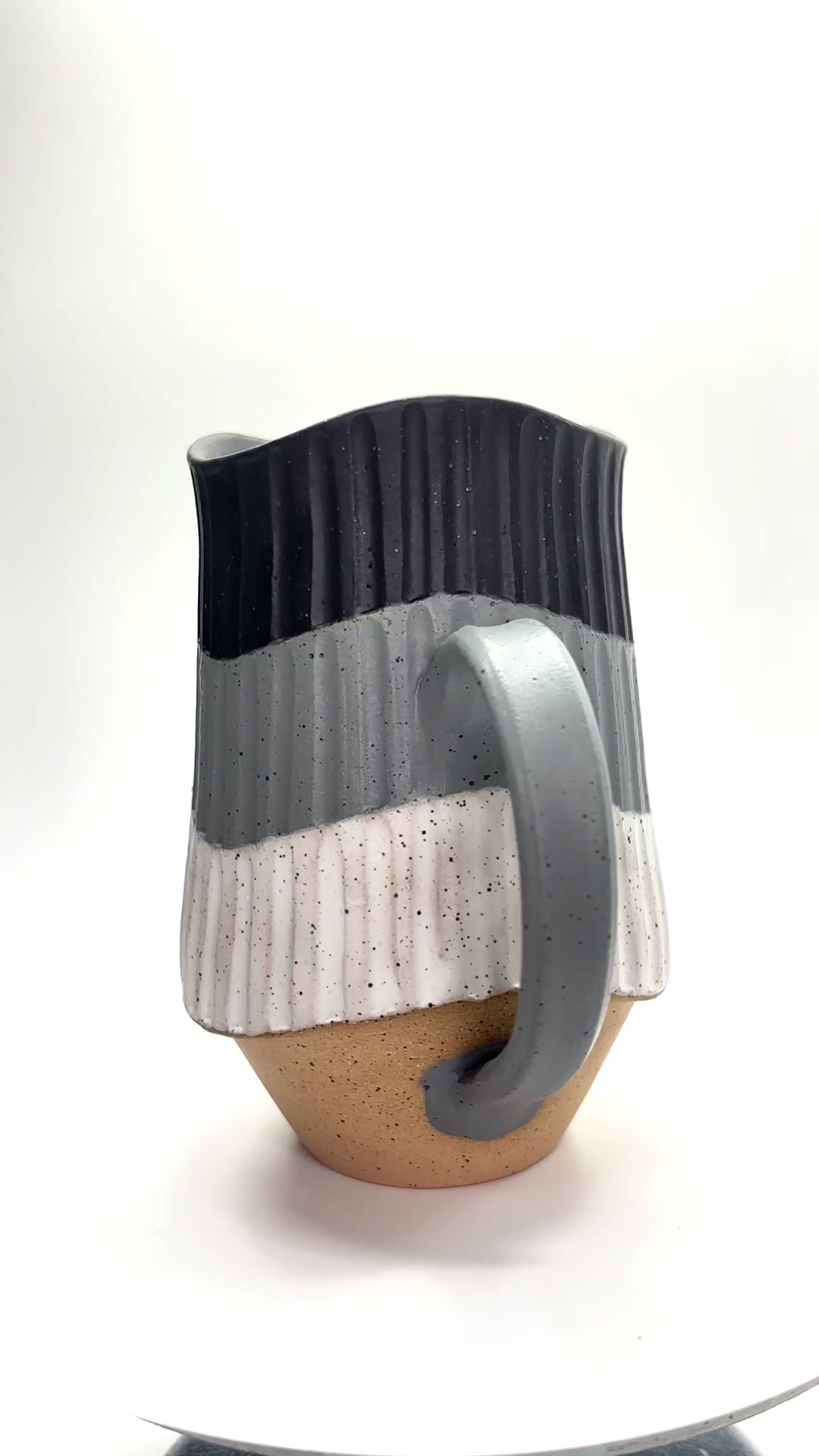 Wheel thrown from speckled stoneware, altered and hand carved in a wave pattern. Glazed with matte glazes, fired to cone 6 oxidation. The wave is my latest challenge/journey in this line of work. It challenges my carving tool which wishes to carve straight lines only, so achieving this look takes more planning but also more fun when it comes out this good! Enjoy :)
