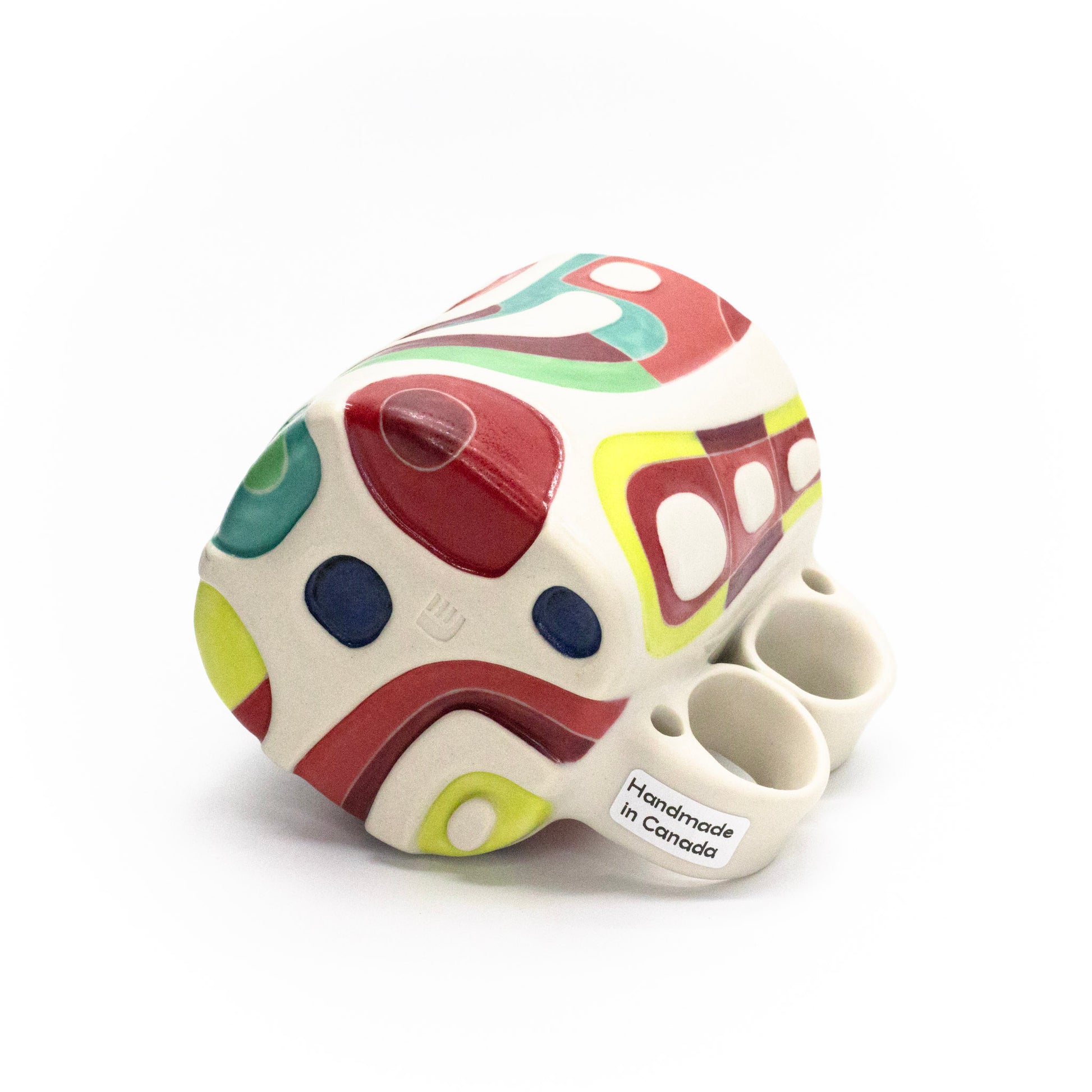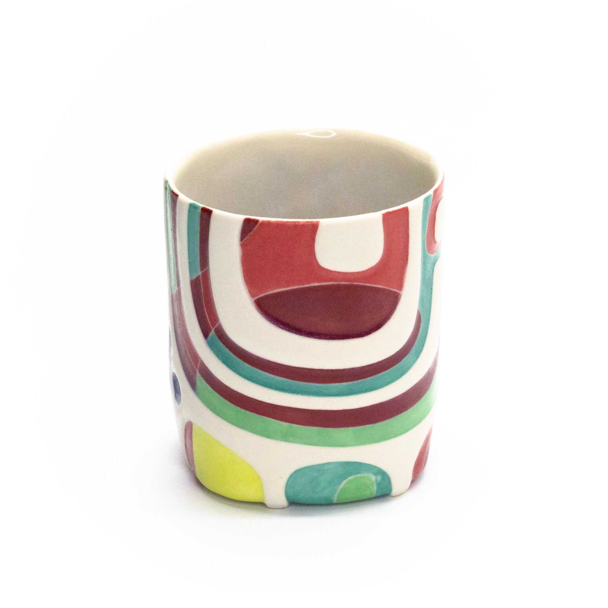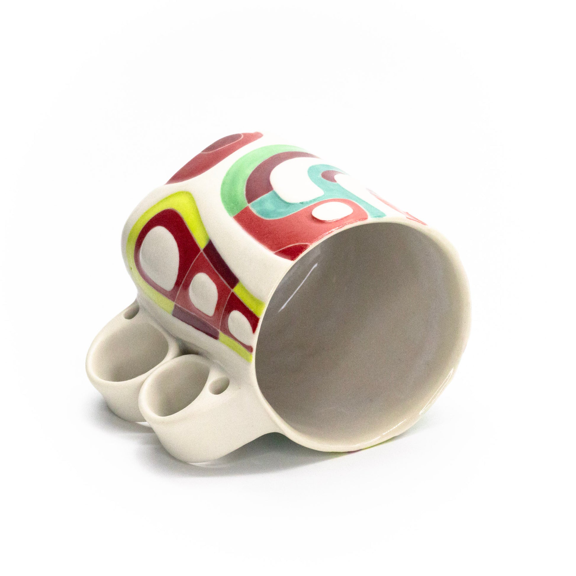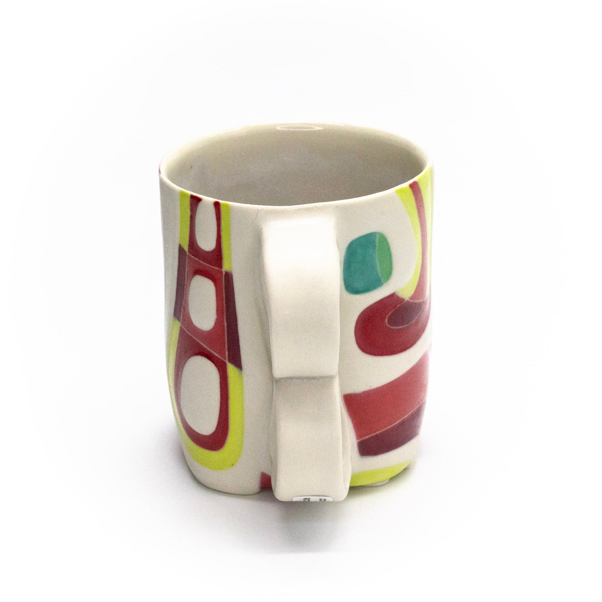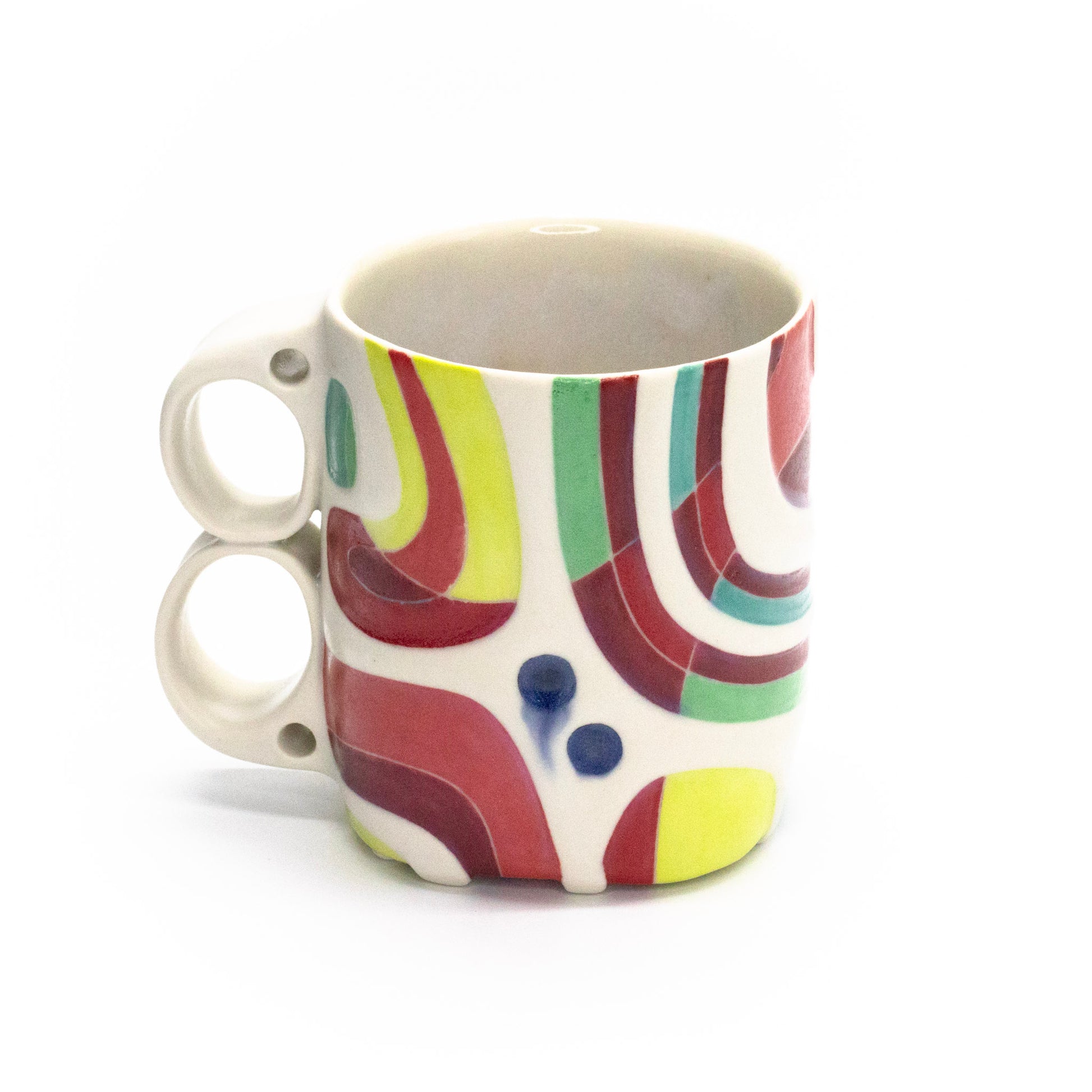 porcelain, underglaze, multiple glazes; cone 6 oxidation; 4'H x 3.5"D x 5.25"W, 16oz; continuous embossing and decoration on bottom