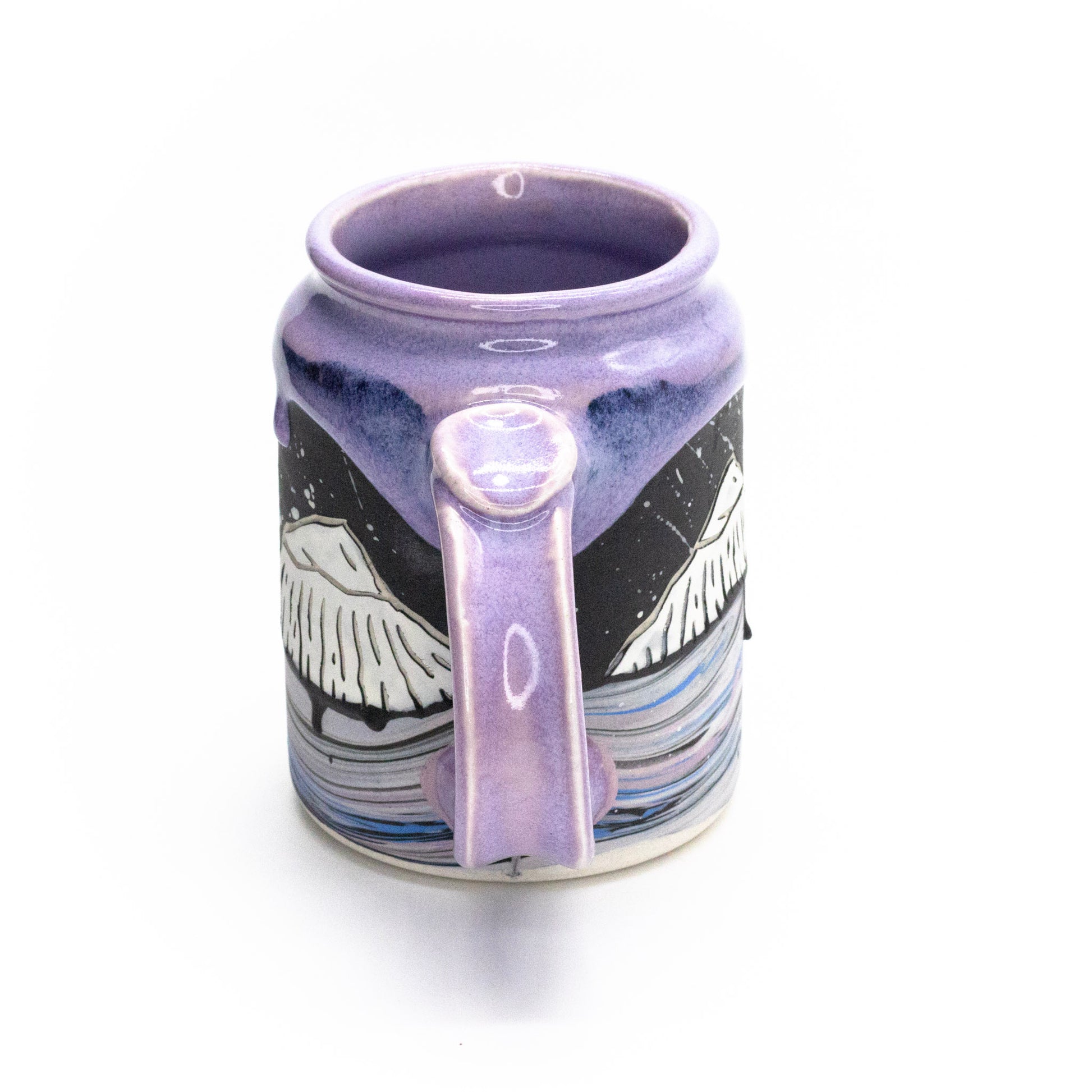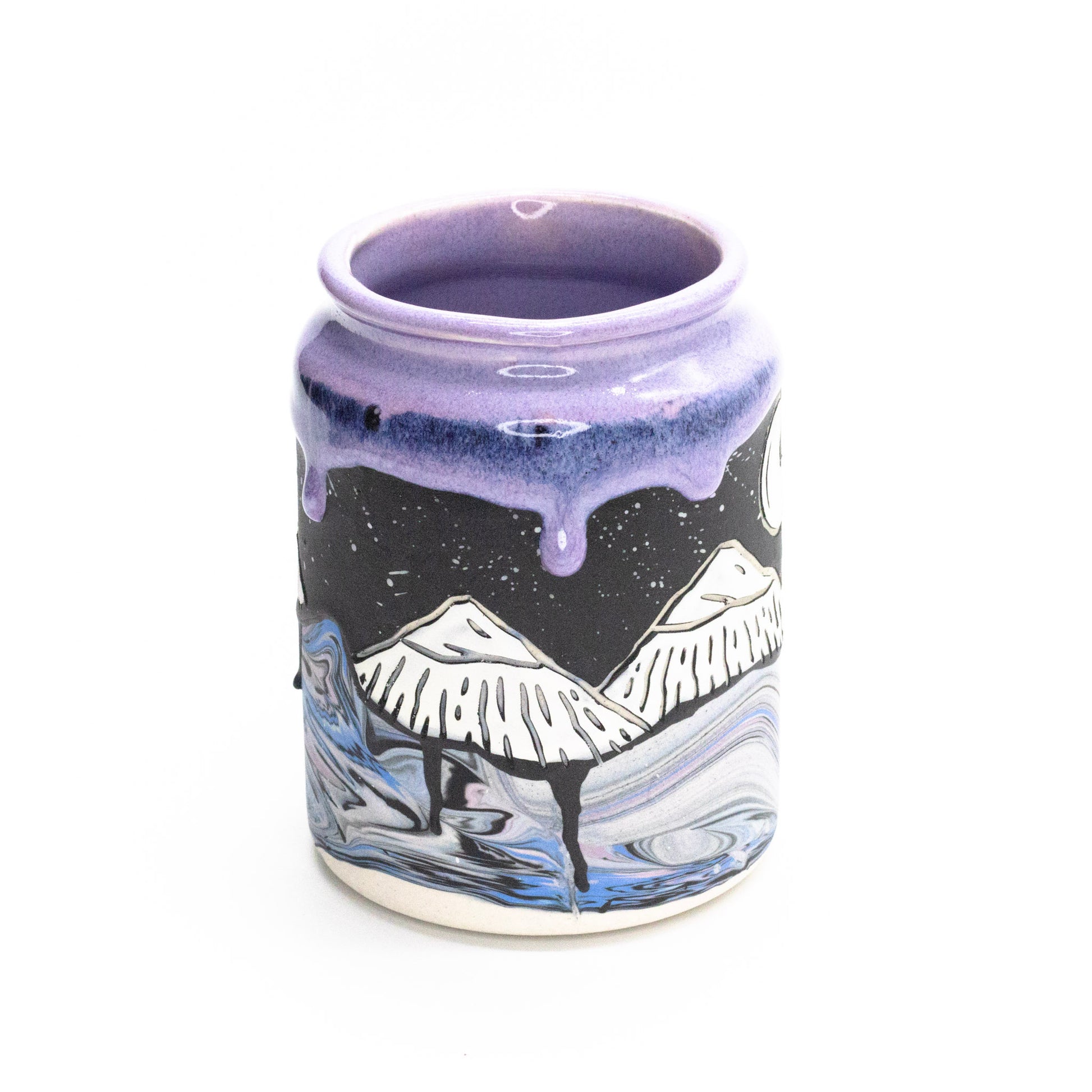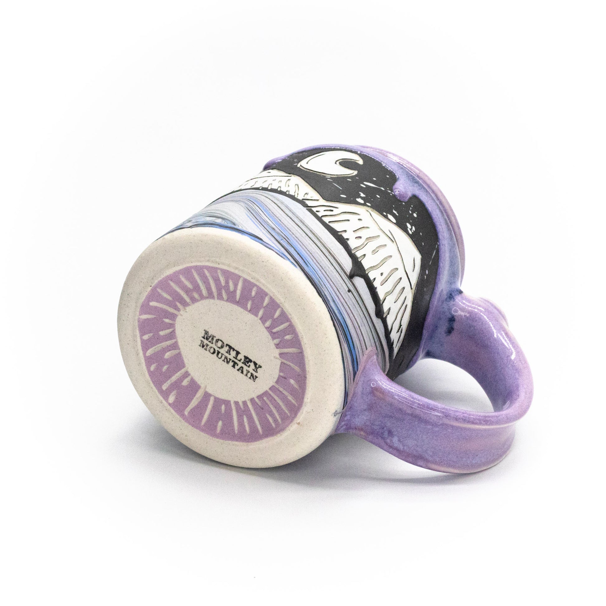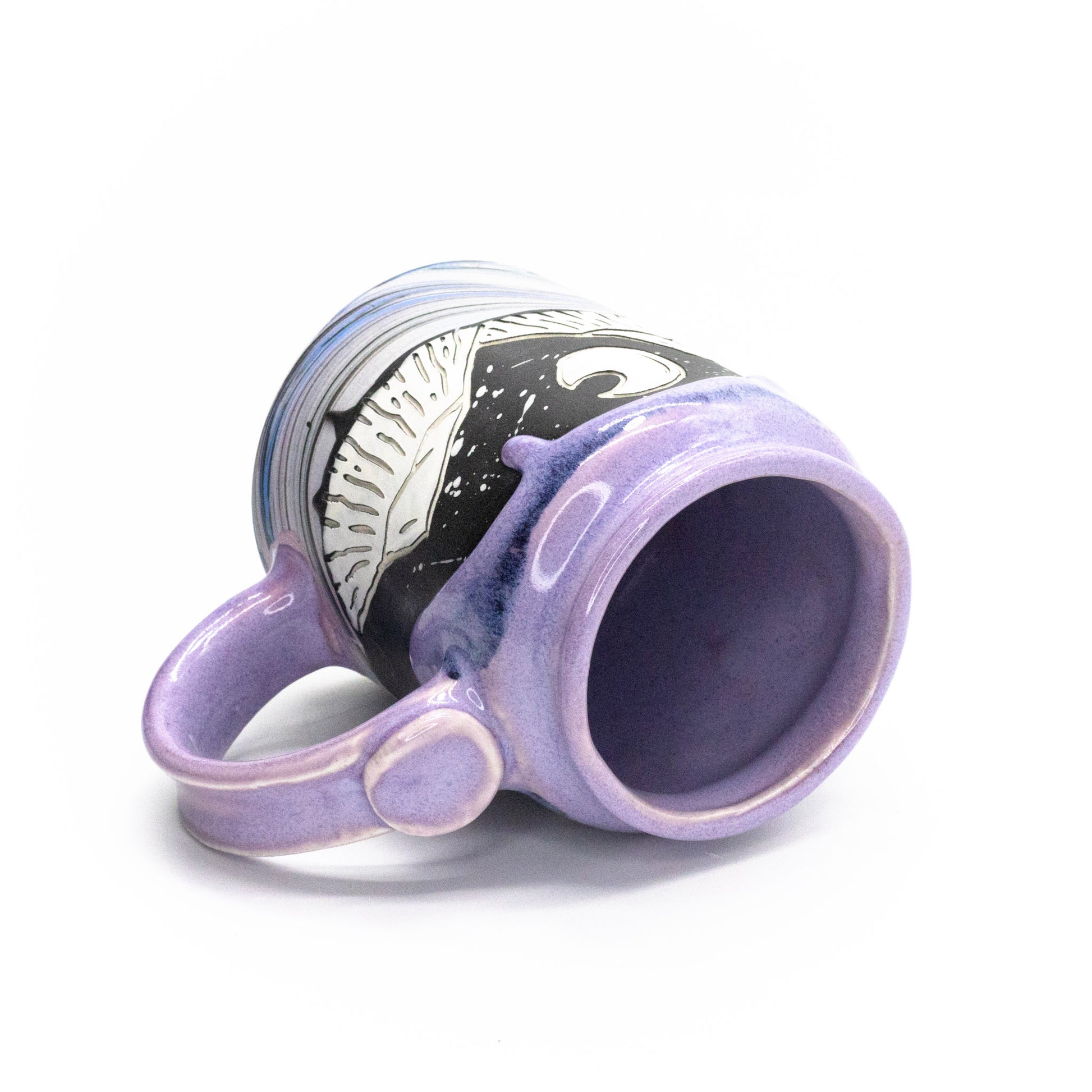 16oz porcelain mug with a combination of sgraffito and multi-colored marbled slip surface decoration. Fired to cone 6 and measured at 5.5in x 4.5in x 3in.