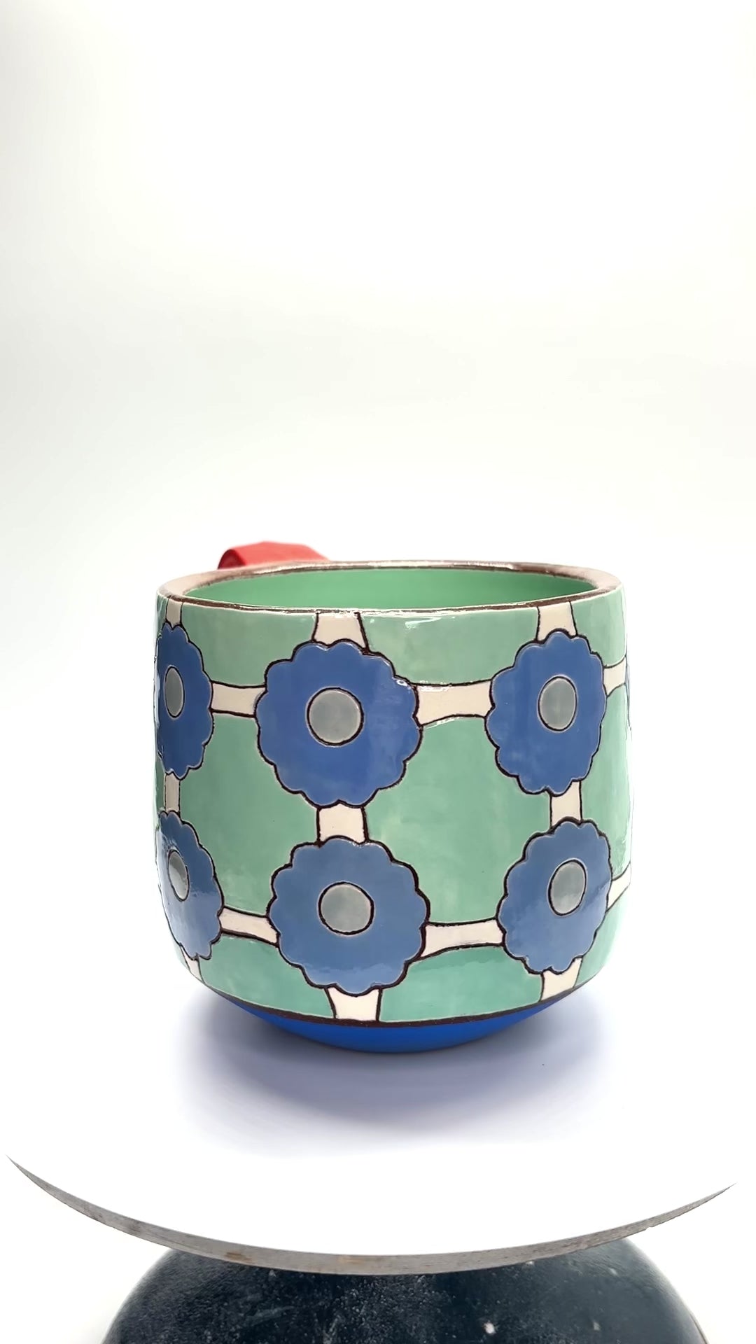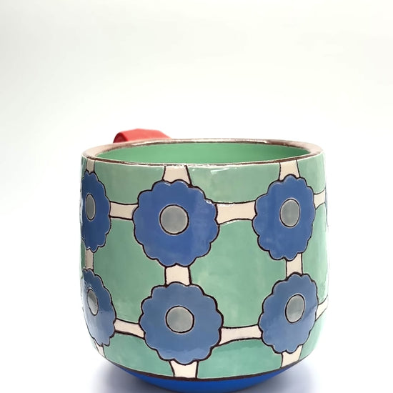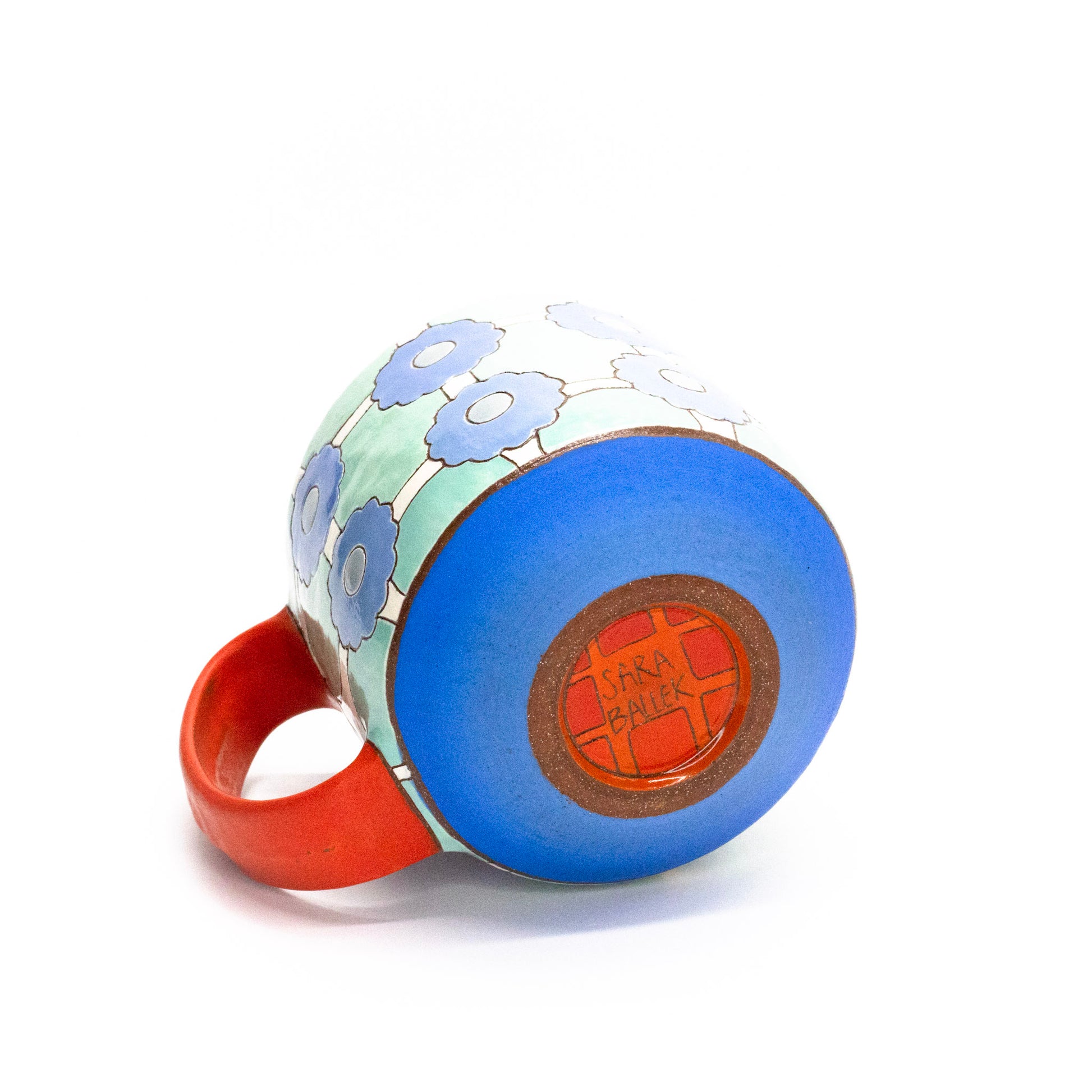 Red earthenware clay layered with slip, underglaze, and clear glaze. The handle and gradient band on the bottom portion are left unglazed and sanded super smooth. Fired to cone 4. Dimensions: 3.6 inches (h) x 3.9 inches (w). Holds a smidge over 16 fluid ounces comfortably.
