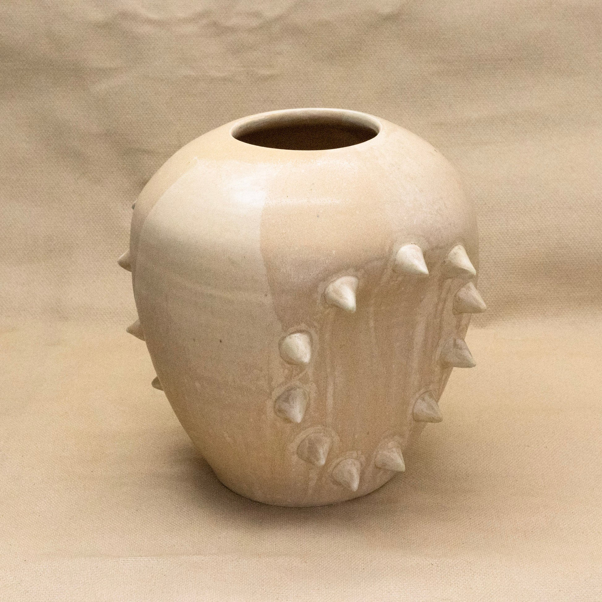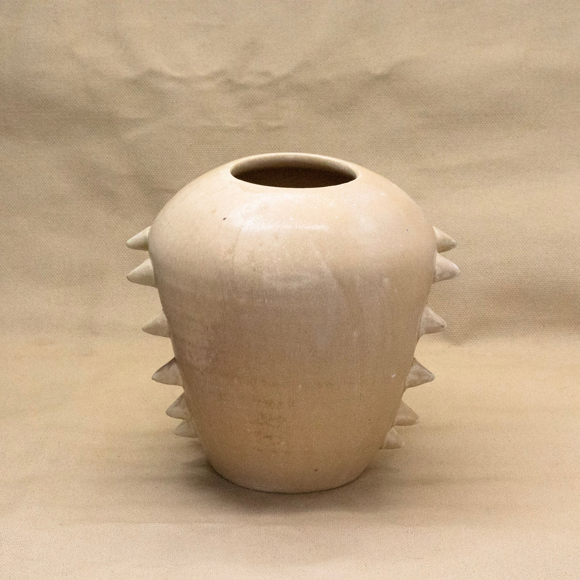 A wheel thrown and altered spiky vase with a sandy glaze. Water sealed 10" by 6.5".