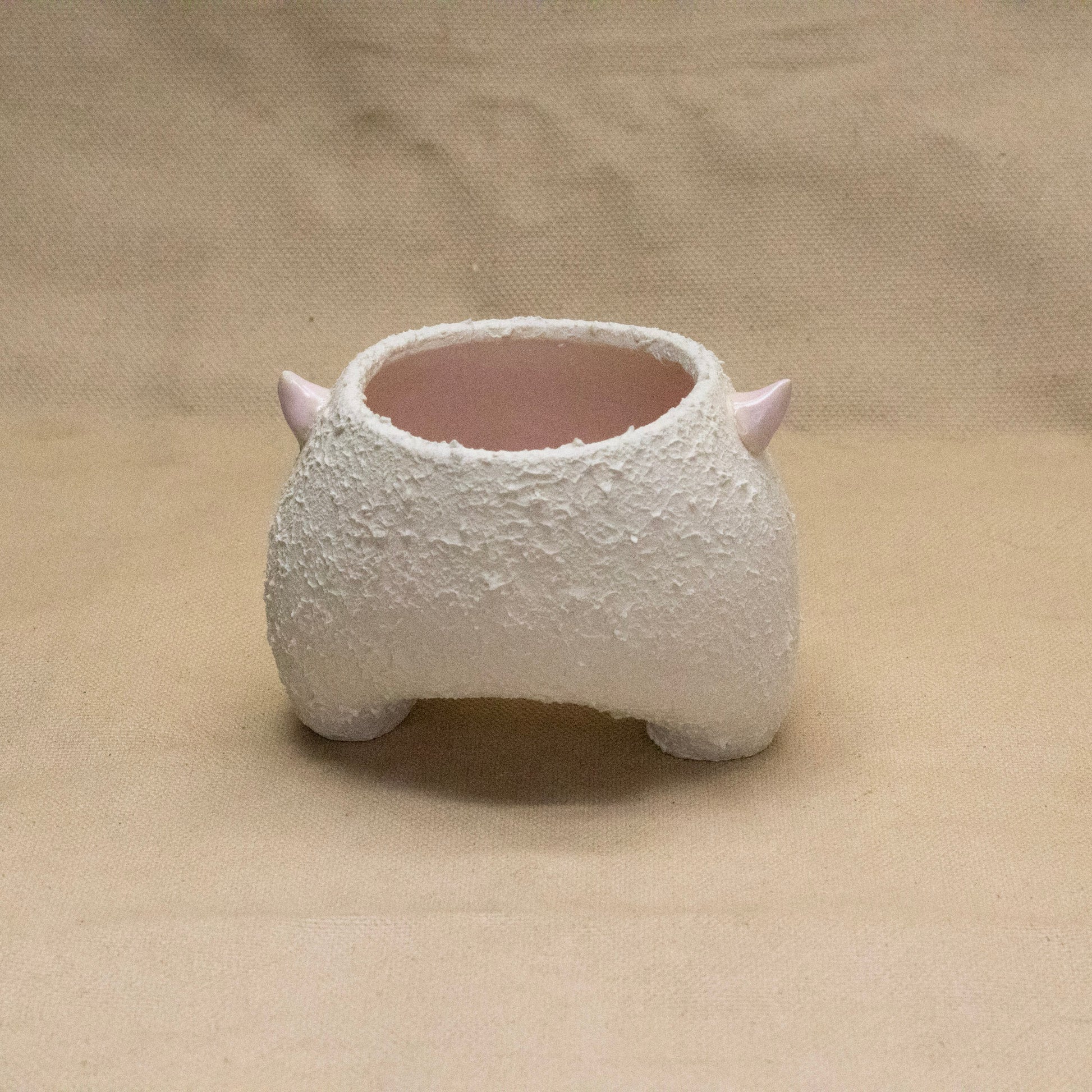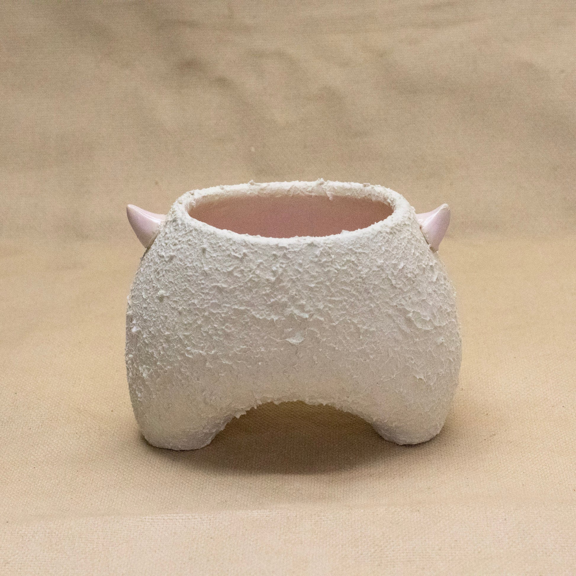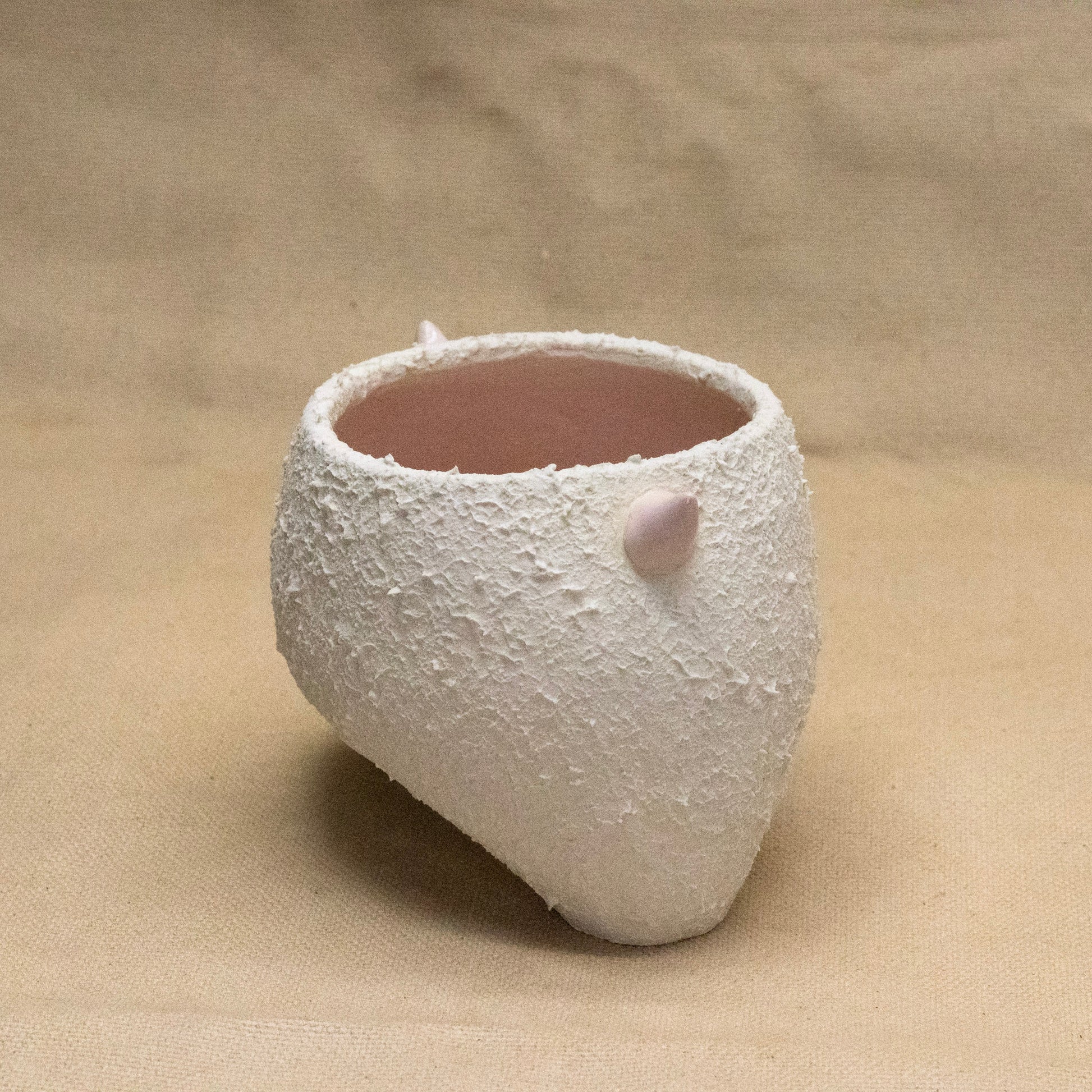 A wheel thrown and altered horned vase with a pink interior. Textured and glazed. 3" by 5". Not recommended for food.