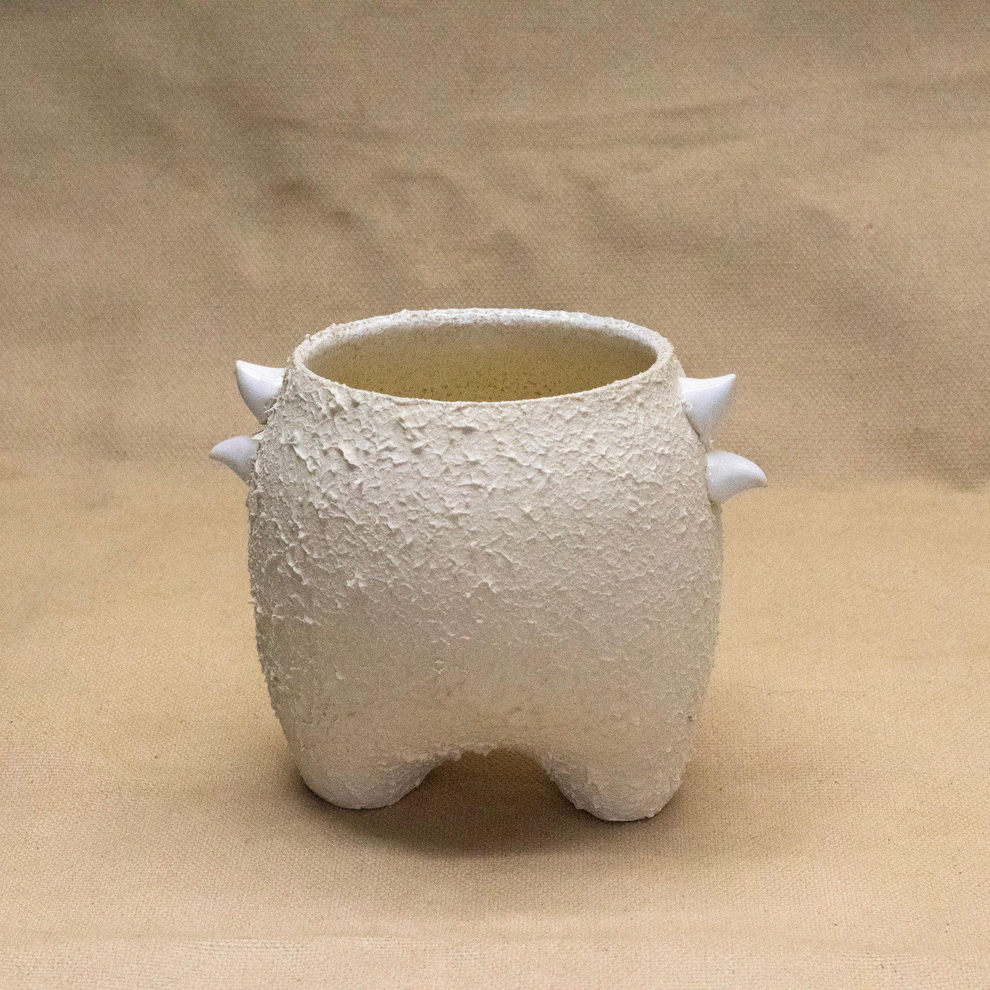 A wheel thrown and altered horned vase, resembling a highland cow. Textured and glazed. 4" by 4". Not recommended for food.